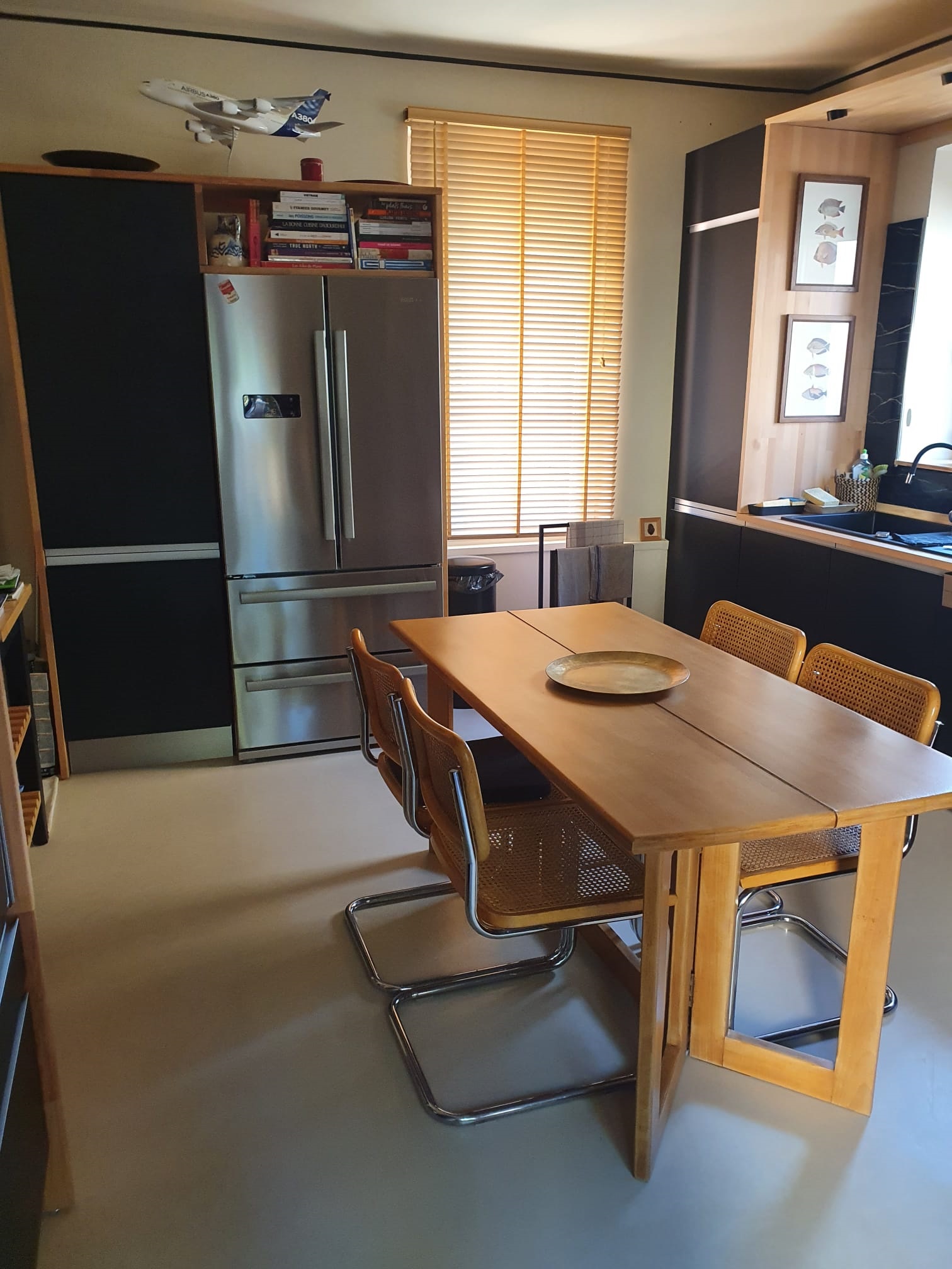 L’îlot central en béton ciré peut servir de surface de préparation pratique tout en offrant un espace confortable pour les repas. Imaginez-vous rassembler famille et amis autour de cet îlot unique, créant ainsi une atmosphère conviviale dans votre cuisine.