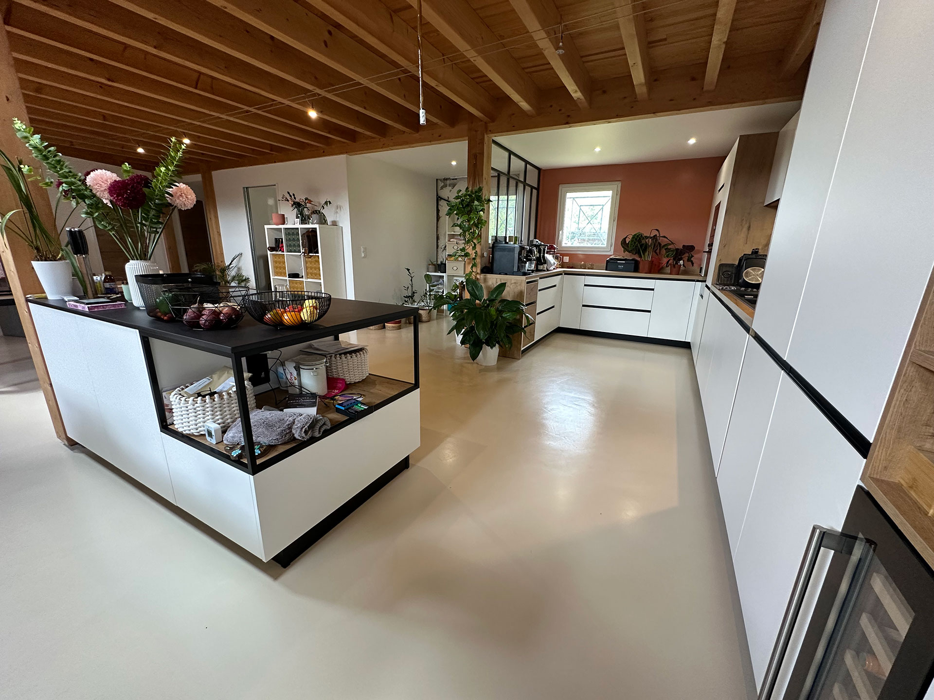 Les sols en résine (époxy ou polyuréthane) offrent une résistance exceptionnelle aux chocs et à l’usure. C’est un choix parfait pour les pièces de vie comme le salon ou la cuisine. Les possibilités décoratives sont infinies : finitions unies, effets flammés, métallisés, ou même incrustations de paillettes.